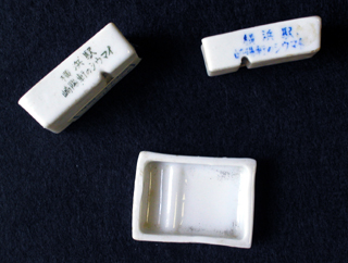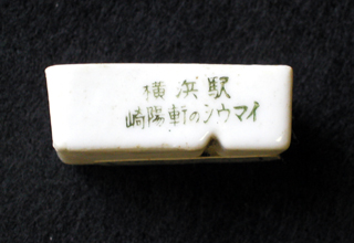 陶器製で作られた時期により側面の 横浜駅崎陽軒のシウマイ の文字の色が異なる。