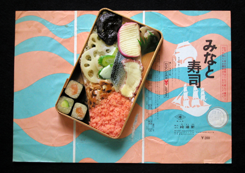 | 現在は、発売されていない みなと寿司です。寿司飯の上に、椎茸の 含め煮、かまぼこ、たこ、しめさば酢蓮、キュウリにでんぶ等が載せ られています。隅には、かんぴょうとキュウリの海苔巻きが添えられて います。おつけものは、確か奈良漬けが付けられていたと記憶してい ます。 瓜生忠夫著「駅弁物語」昭和54年7月3日刊によれば、みなと寿司 は1979年4月現在の発売価格は、400円とのことです。 |