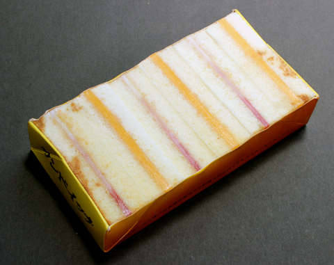 | サンドウイッチのサンプルです。 サンドウイッチの掛け紙とも言える蓋がありません。どうもサンドウイッチを駅弁として認識していなかったのでコレクションしていなかったか内容と比べて価格が高いので食べなかったのどちらかです。掛け紙が無いのに、 シウマイ娘のおばさんが捨ててくれたおかげで、サンドウイッチのサンプルコレクションが出来ました。 |